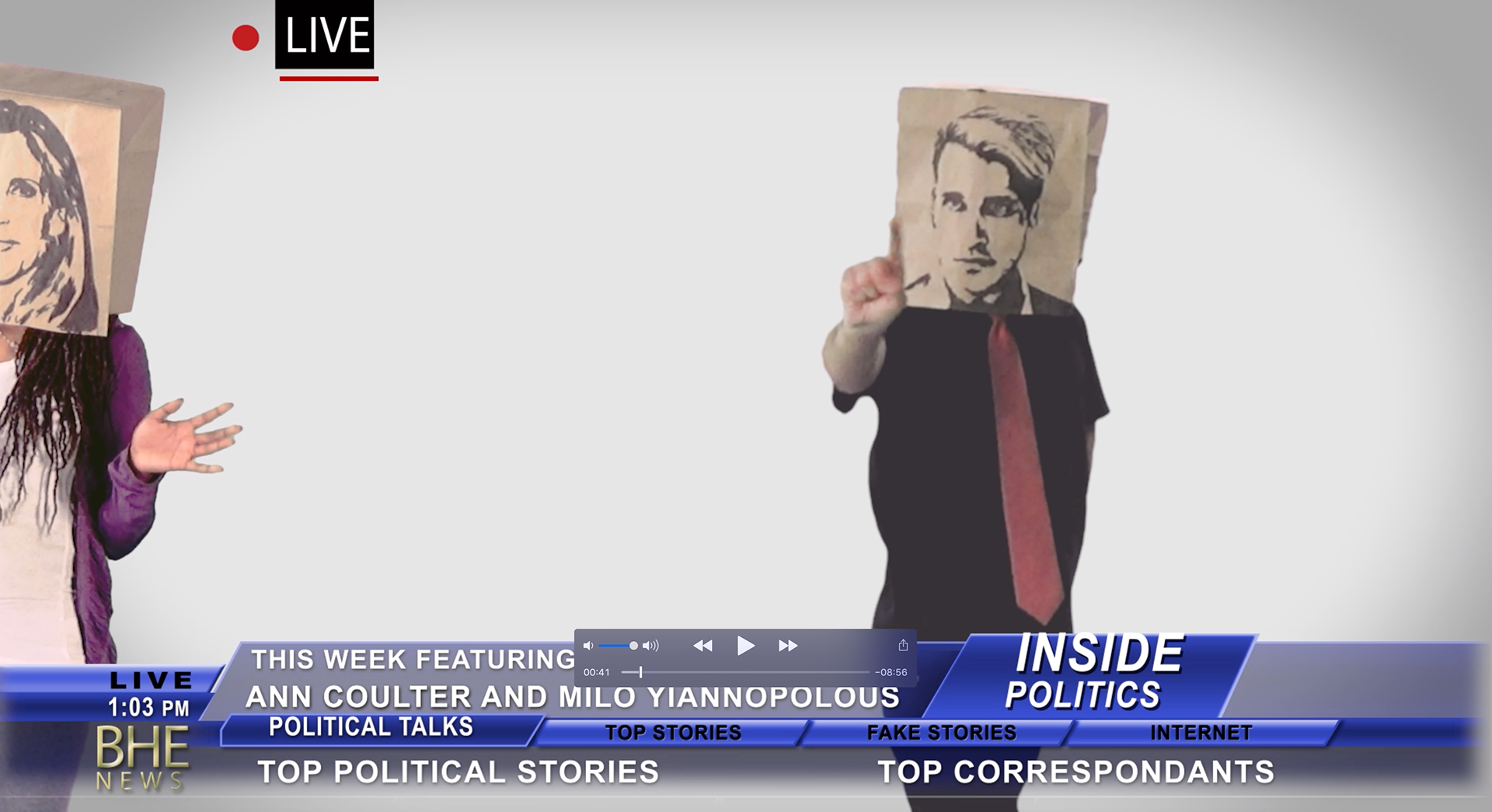 BHE_centre is an ongoing project by Blue Hour Endeavours which presents four fictitious broadcast TV networks, each with their own set of programs and pop cultural content relevant to the queer millennial climate. The programs were each captured on green screen using gestural performances and 'paper bag masks' to reference particular iconic and pertinent moments in pop culture. The first showing of the project was at Eastern Block in April 2016. Julian Cargnello: Lead director, script writer, editor, compositor/animator and performer. Pablo Mora: Performer, editor, script writer. Aneesah Marie: Performer, script writer. Cedric Laurenty: Videographer for Eastern Block exhibit.